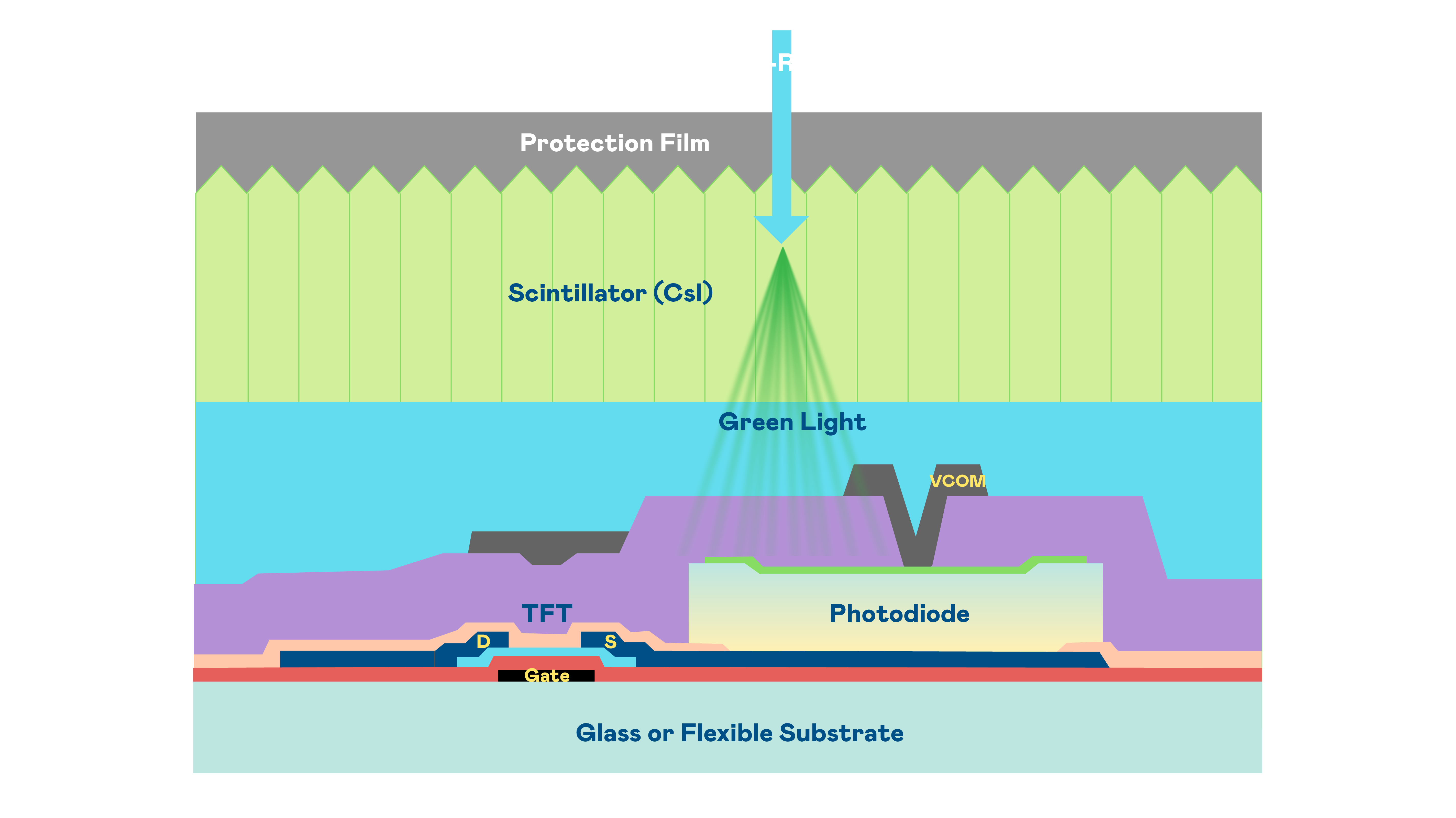 AG贵宾的X光影像感測陣列使用薄膜電晶體 (TFT) 作為每個像素的讀取開關,搭配光電二極體(Photodiode)的光電轉換元件,用以感測X光影像訊號。